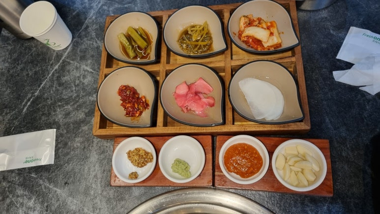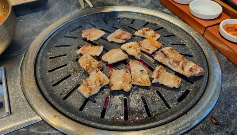 돼지고기다 보니 망불판은 기름이 많이 떨어져 불이 많이 나서인지 돼지고기는 일반 불판으로 바꿔주신다.