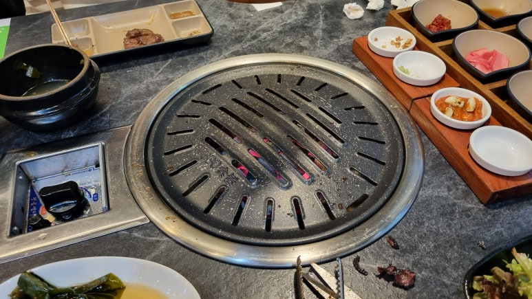 기본 찬과 소스류가 준비되고 이내 숯불도 올려졌다.